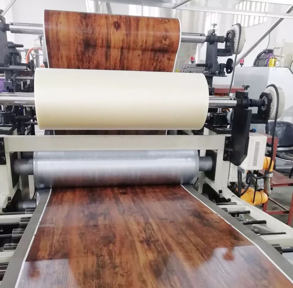 LVT soft composite floor by extruder extrusion floor base material, then through a set of six roller for base material and printing layer composite machine, wear-resisting layer, layer of compound at the same time, through the rolling tension, wear-resisting layer accurate control of preheating, to put the volume not wrinkle, does not shrink, deformation, extrusion compound high production efficiency, product quality is stable.
