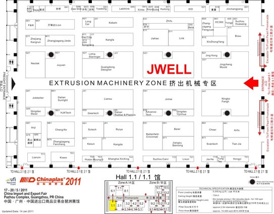 Chinaplas 2011(The 25th International Exhibition on Plastics and Rubber Industries) will be hold in Pazhou Complex ofGuangzhou city, South of China from May 17 to 20.This time our company Shanghai Jwell Extrusion machinery co., Ltd will carry kinds of machinery and equipments to show in the exhibition, such as: horizontal double-wall corrugated pipe forming machine, 1600mm vacuum tank, plastic extruder, glaze tile forming machine, blow molding machine, three-roller calender system, T-die, roller, crusher, recycling machine, screw and barrel etc. We have two big booths which are located in Hall 1.1 booth number D21 and Hall 5.1 booth number M41.Welcome to our Booth.